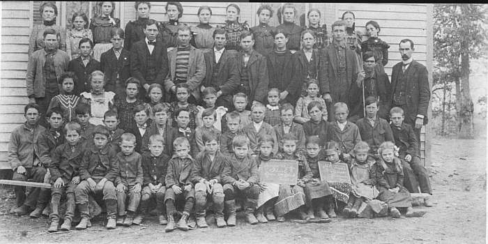 Third: Olie Welhouns, Maud Smith, Sarah Meyer, Ethyl Odom, Mary Meyer, Mary Stepp, Mary Carrender, Jennie DArity and Vertie Sibert. Fourth: Charley Carrender, Edd Harbison, Clyde Bowden, Byron Clark, Herb Carrender, Jim Kallenbach, Oscar Carrender, Walter Wright, Lawrence Meyer, Dan Thompson, Orville Shackleford and Dion Clark, teacher.
